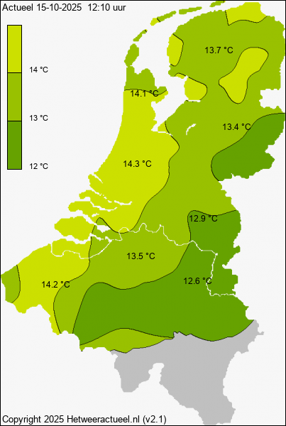 Het kaartje met de actuele temperatuur wordt iedere 10 minuten opgebouwd uit de actuele gegevens van alle weerstations, mits de data minder dan 1 uur oud is.