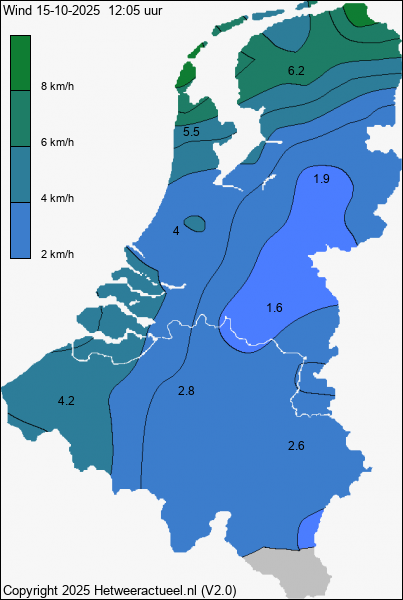 Het kaartje met de actuele wind windsneldheid (10 minuten gemiddelde) wordt 2 keer per uur opgebouwd uit de actuele gegevens van alle weerstations, mits de data minder dan 1 uur oud is.